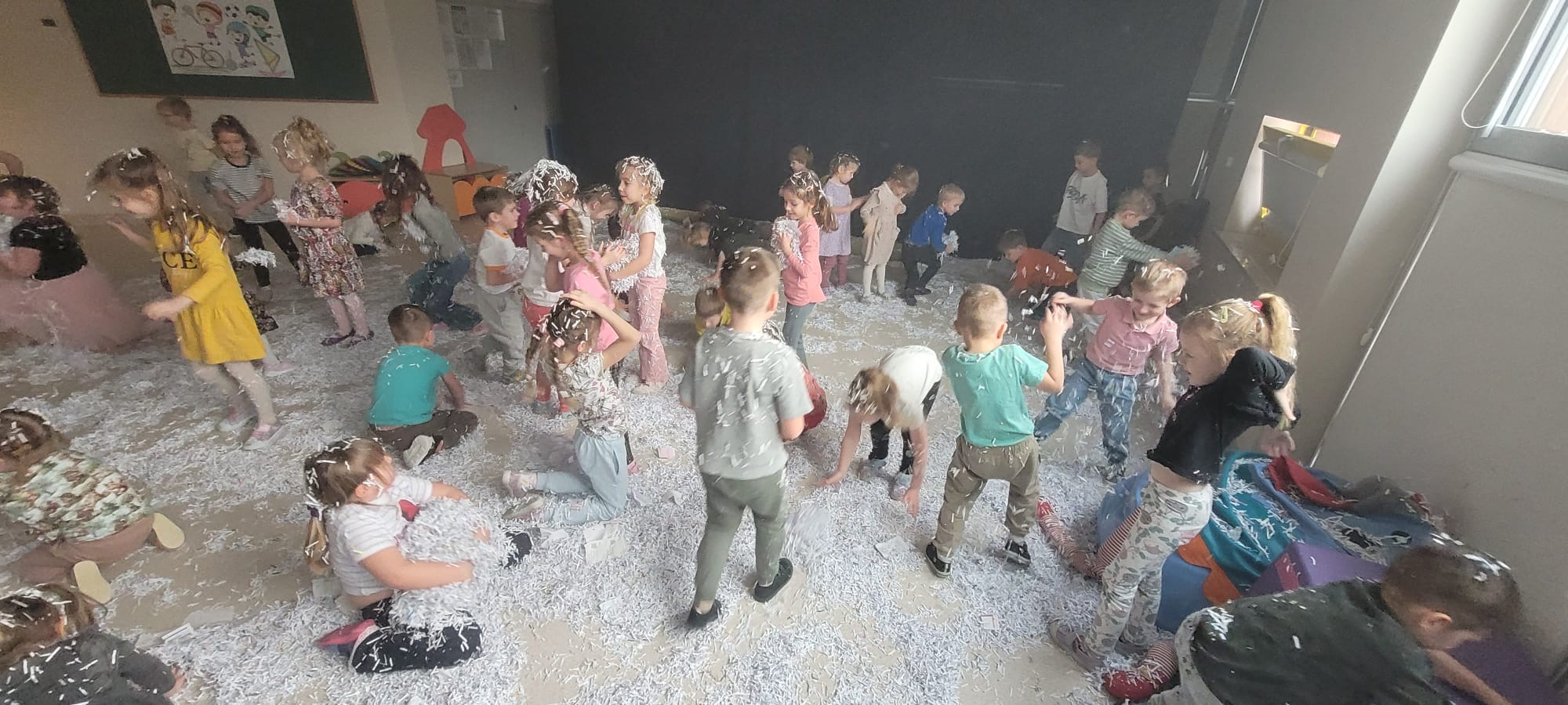 W przedszkolu odbyła się zabawa sensoryczna z wykorzystaniem ścinków z gazet. Wszystkie dzieci chętnie uczestniczyły w aktywności. Ponieważ na podwórku brakuje śniegu, zastąpiliśmy go papierowymi ścinkami, które posłużyły do zabaw w rzucanie, turlanie oraz szuranie nogami. Zabawa sprawiła dzieciom wiele radości, a po jej zakończeniu dzieci z zaangażowaniem posprzątały salę. Teraz z niecierpliwością czekamy na ferie i prawdziwy śnieg